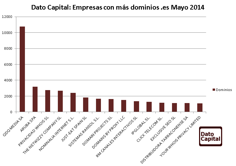 En Dato Capital hemos analizado todas las titularidades de más de 1,7 millones de dominios .es y hemos recopilado las 15 primeras. Estos datos son relativos a Mayo de 2014.